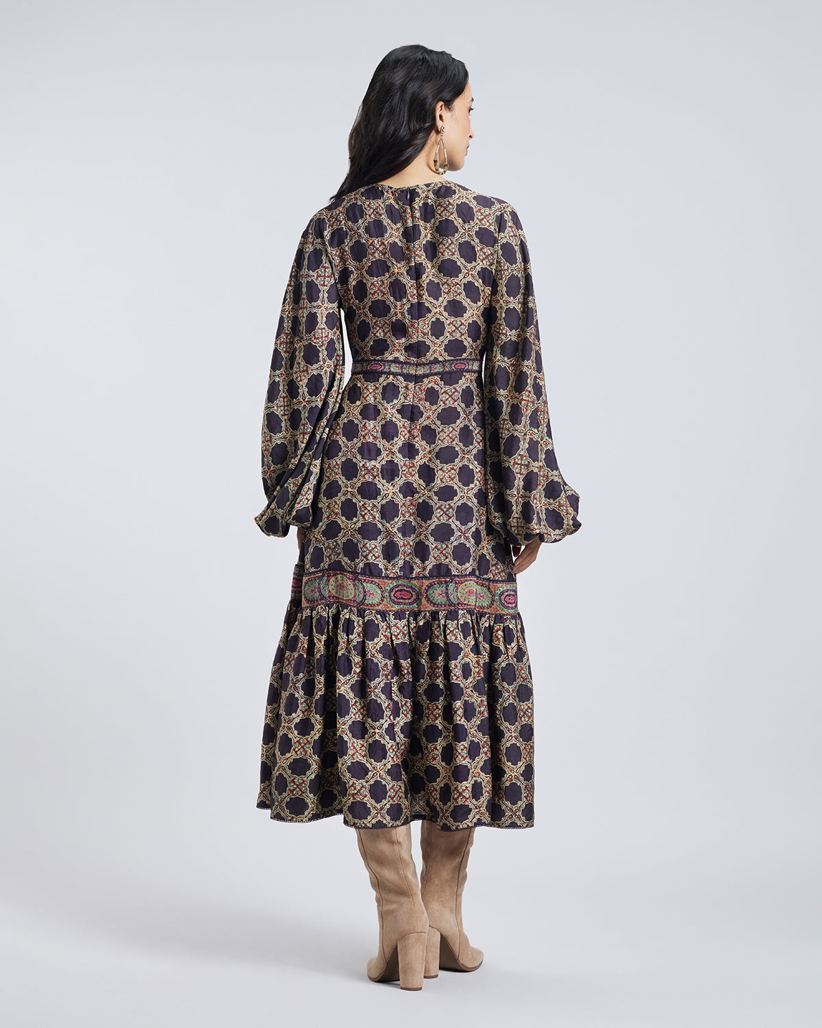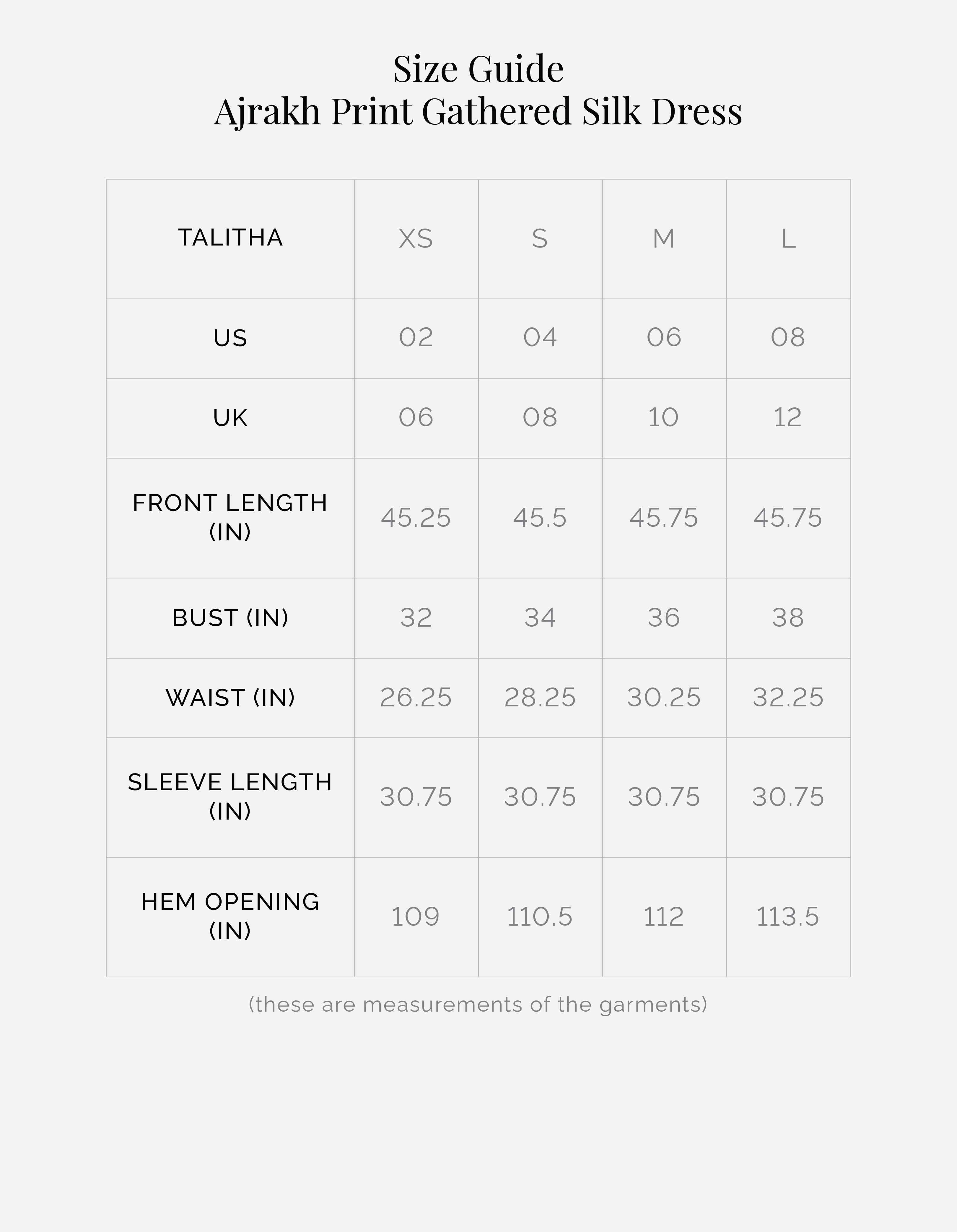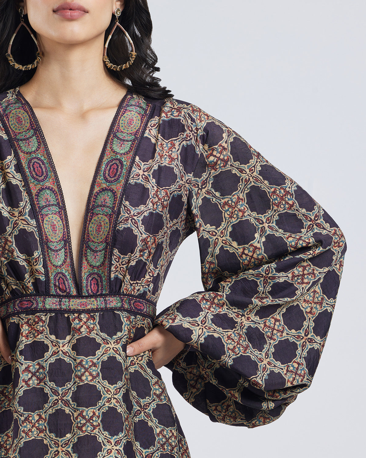 Made from silk habotai, this tiered skirt embodies a mix of fit and flare with its V-shaped neckline, voluminous bell sleeves, and heavy gathers. The dress is completely adorned with our modern Ajrakh-inspired print, featuring colours of regional and cultural significance.
