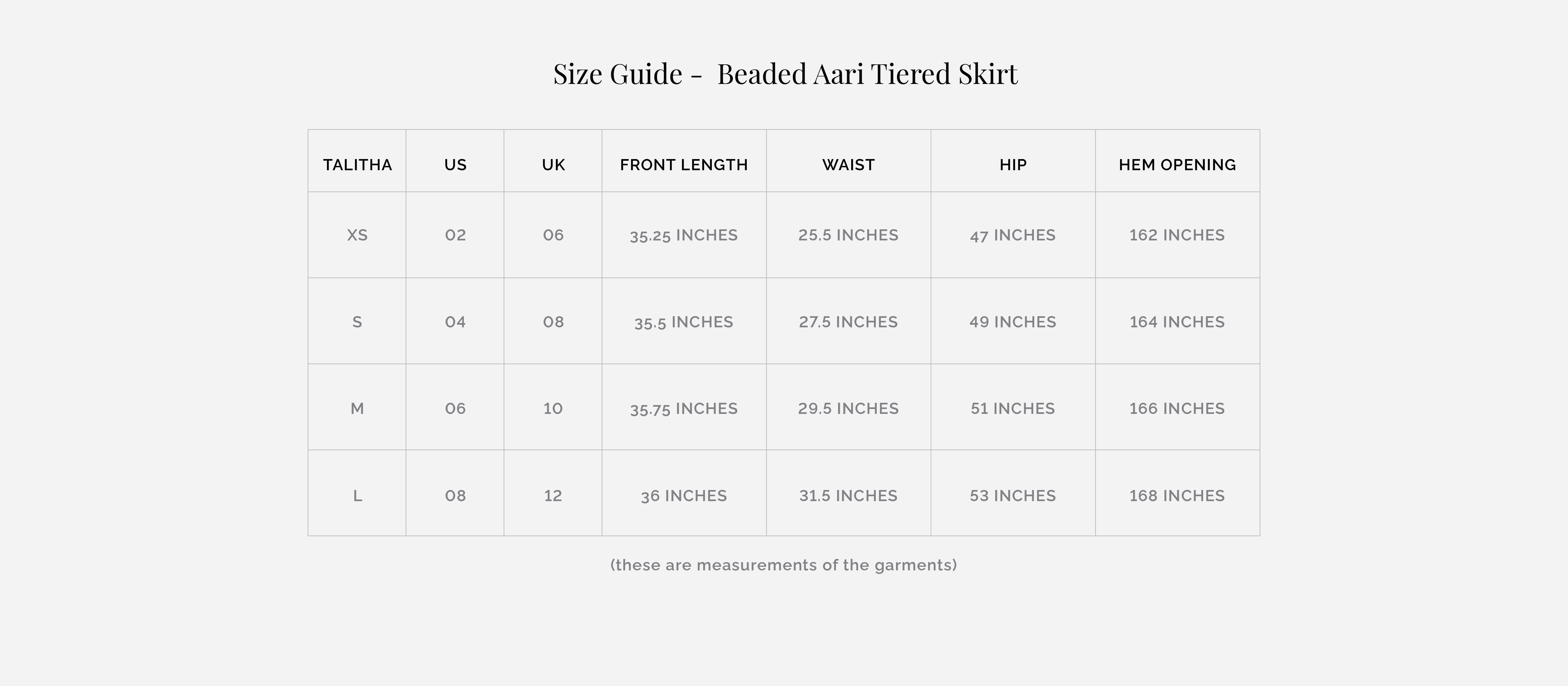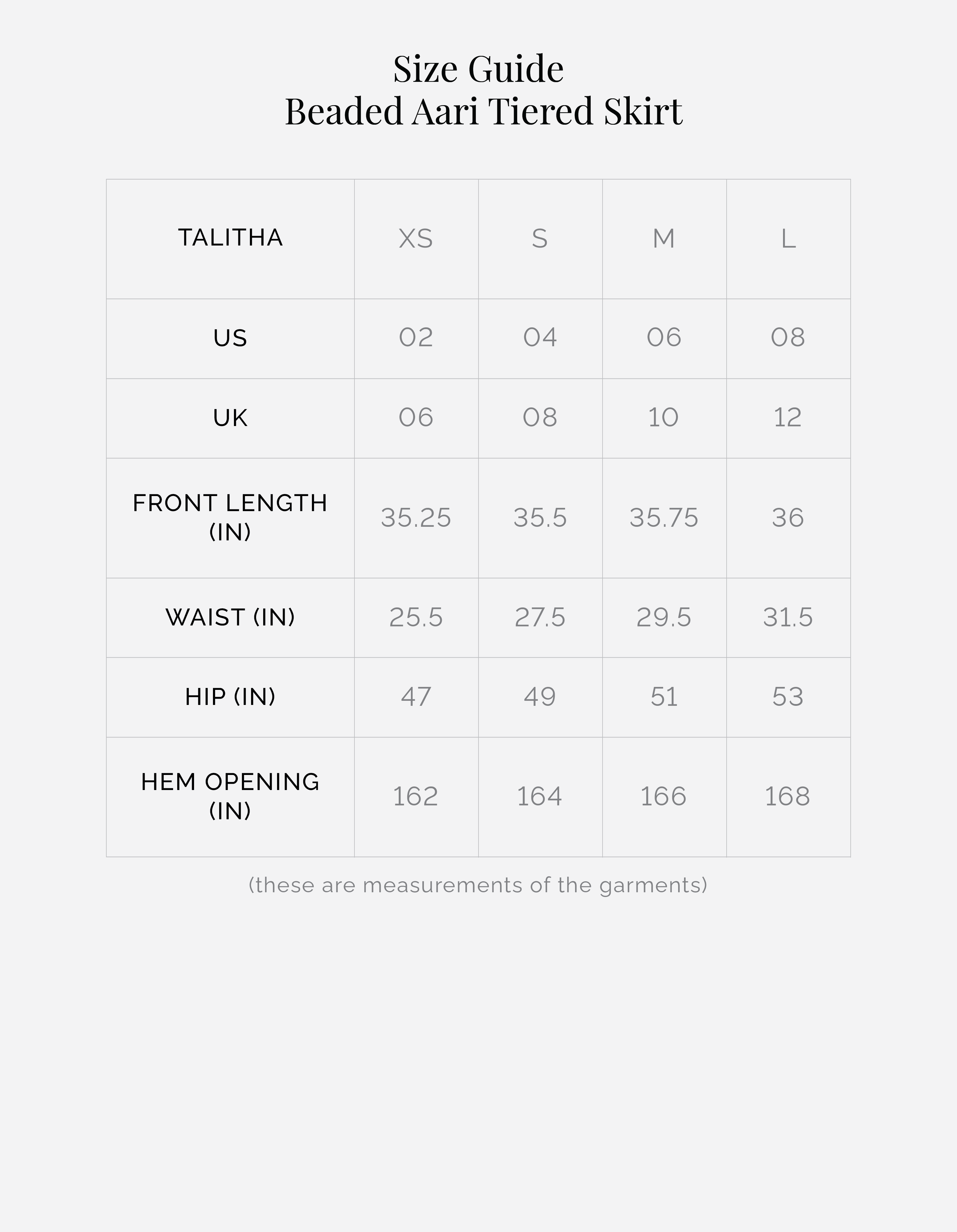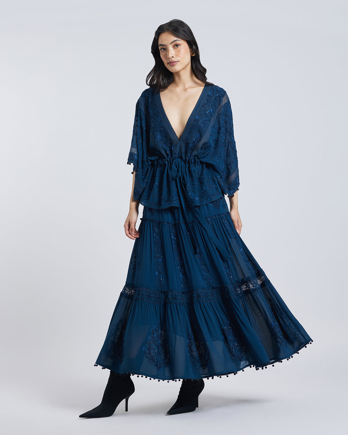 Designed to be worn at one’s natural waistline, this midi-length skirt is crafted in-house, and is adorned with Art Nouveau-inspired Aari embroidery and beading work. The garment is lined and also includes lace inserts, trimmings along the hem, and a side seam zipper closure.