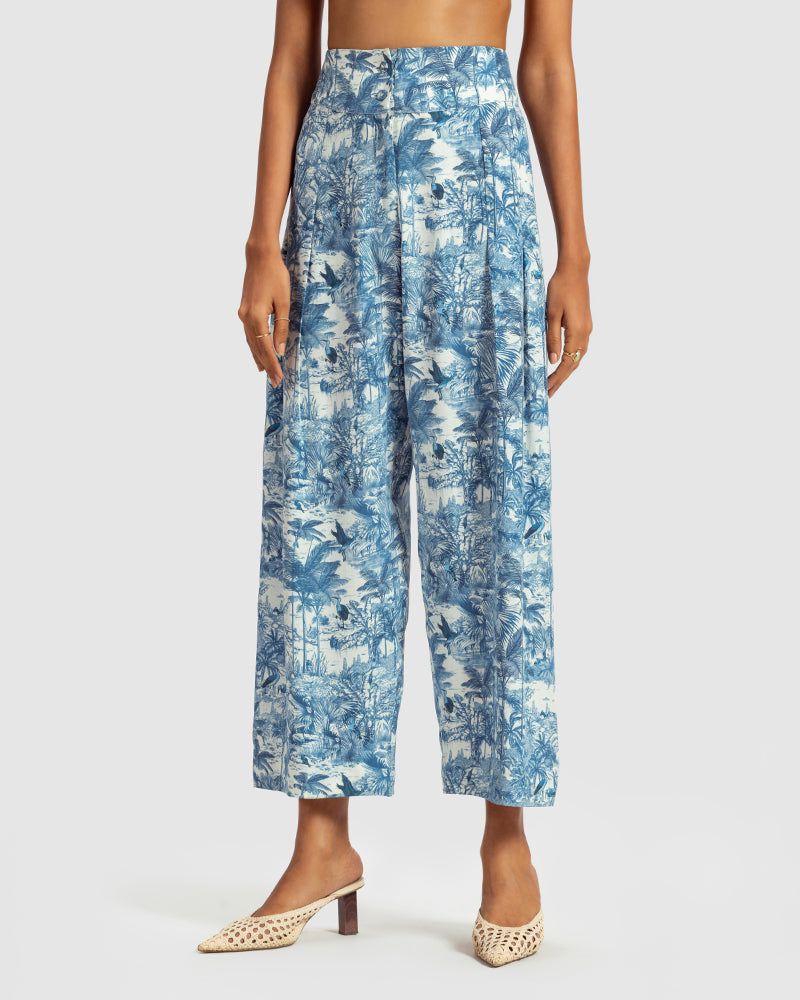 Made from cotton twill, these high-waisted pleated pants feature our statement tropical print that reimagines Indian flora and fauna motifs with contemporary blue colourways. The garment comes in a relaxed fit, and also includes a waistband with a two-button closure, a centre-front zipper closure, and side pockets.