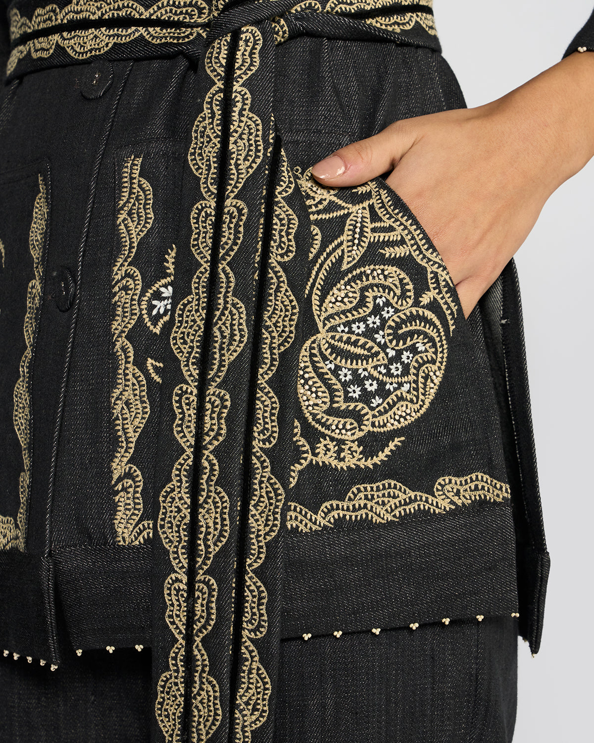 Crafted using soft cotton denim, our Bridget co-ord set features a stylish shacket and matching flared pants, combining timeless femininity with modern bohemian chic. The shacket is further accentuated with slide slits, intricate hand-beaded details, and patch pockets. Designed for a regular fit, the co-ord set also comes with a hand-embroidered belt, making for a sleek yet breathable silhouette.