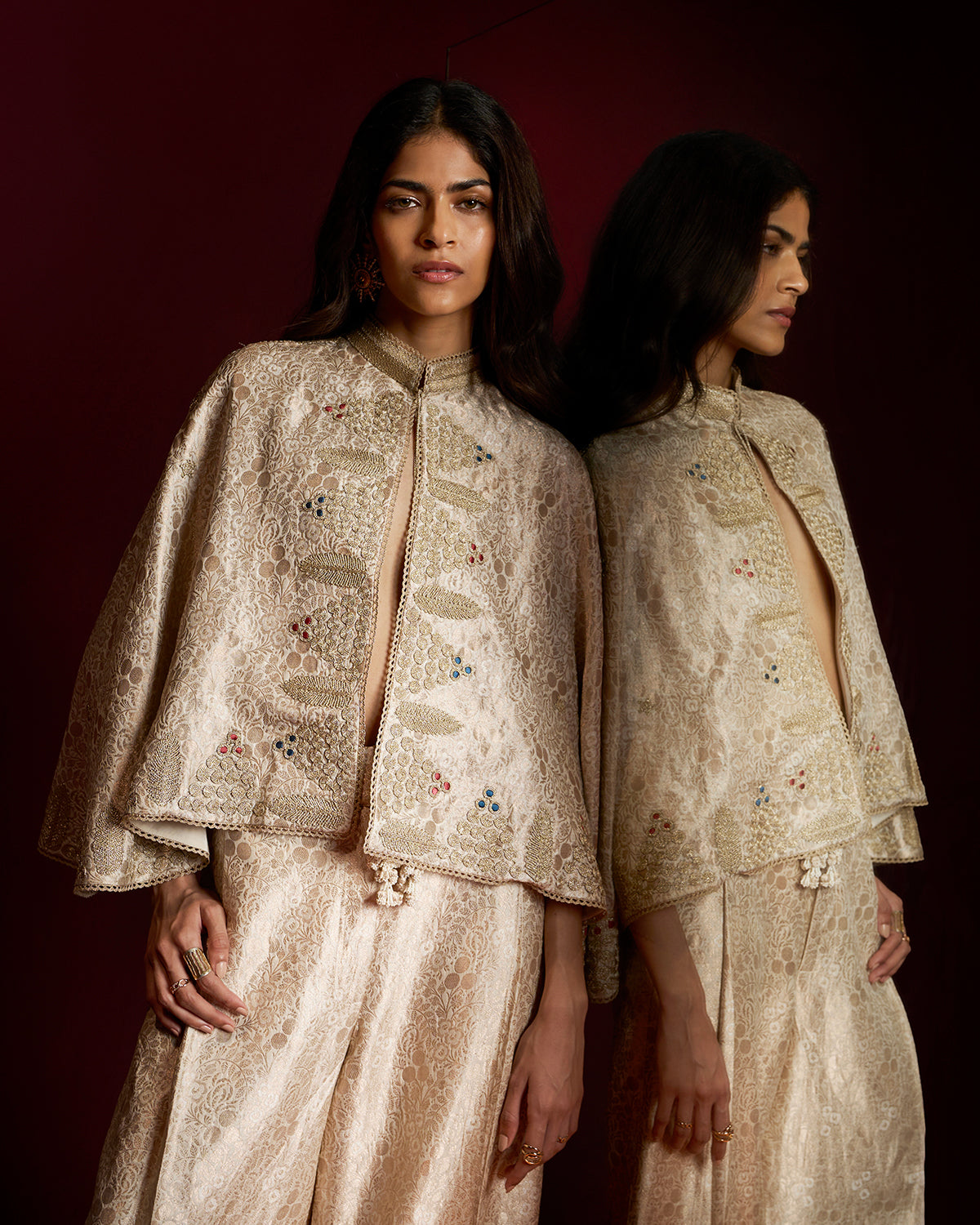 This luxurious cape, made from handwoven Banarasi tanchoi brocade, is the epitome of opulence. Designed for a relaxed fit, this heirloom is enveloped in glistening handcrafted motifs in gold zari threads, and also features contrast satin stitch embroidery and artisanal tassels.