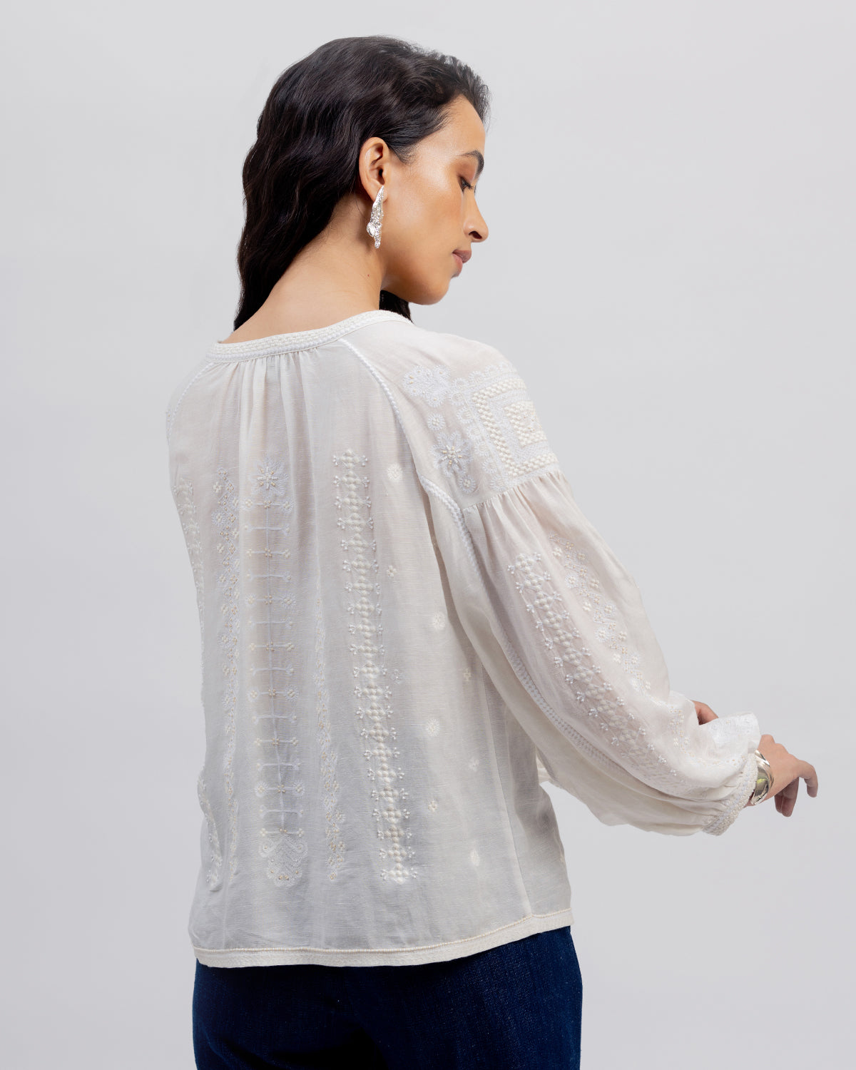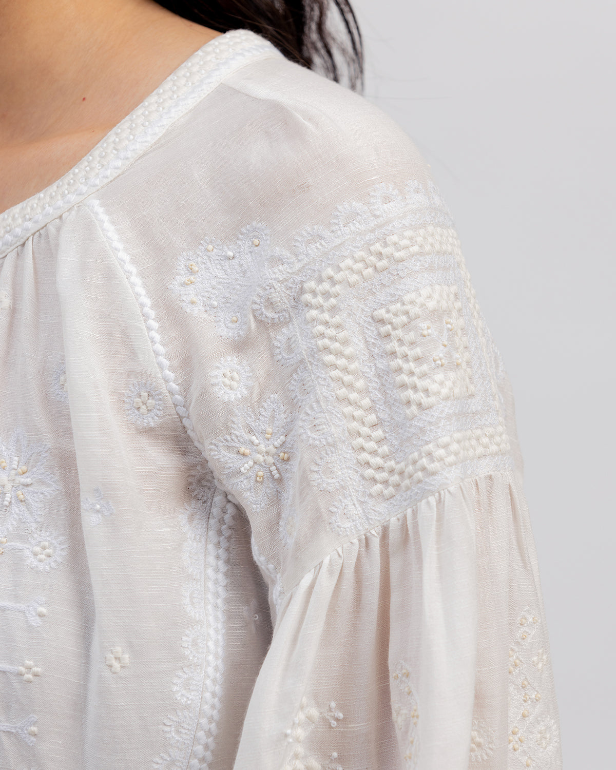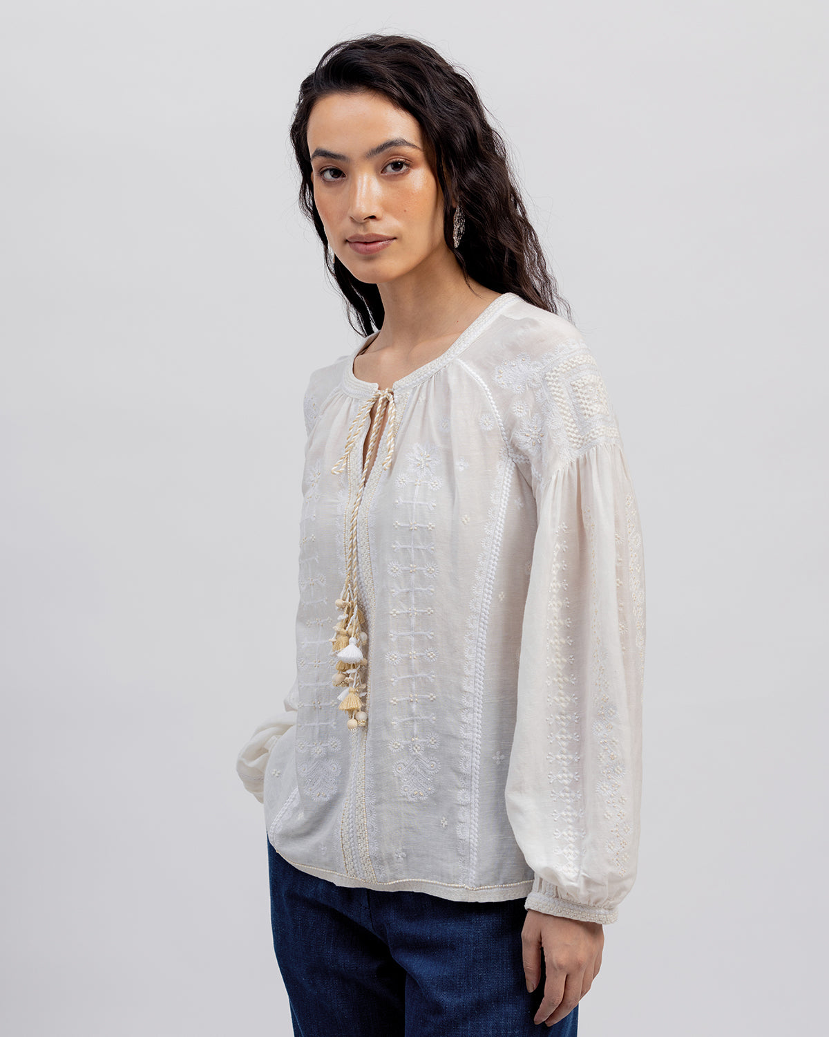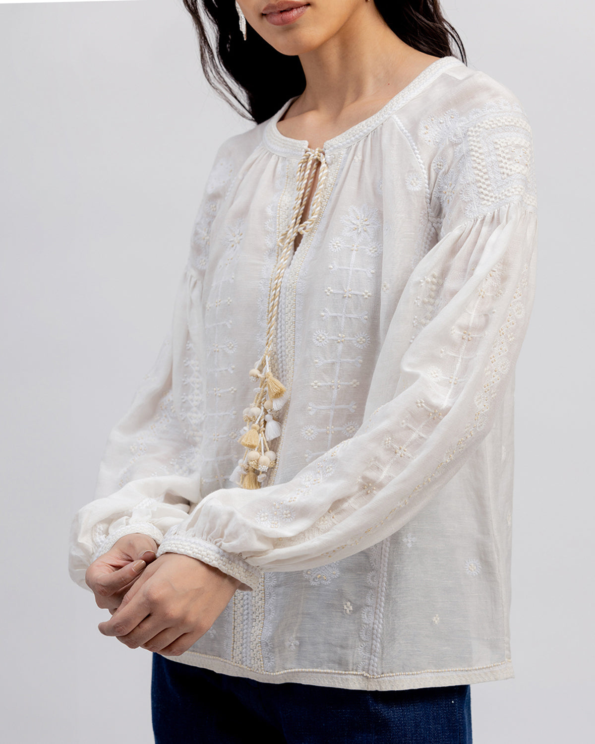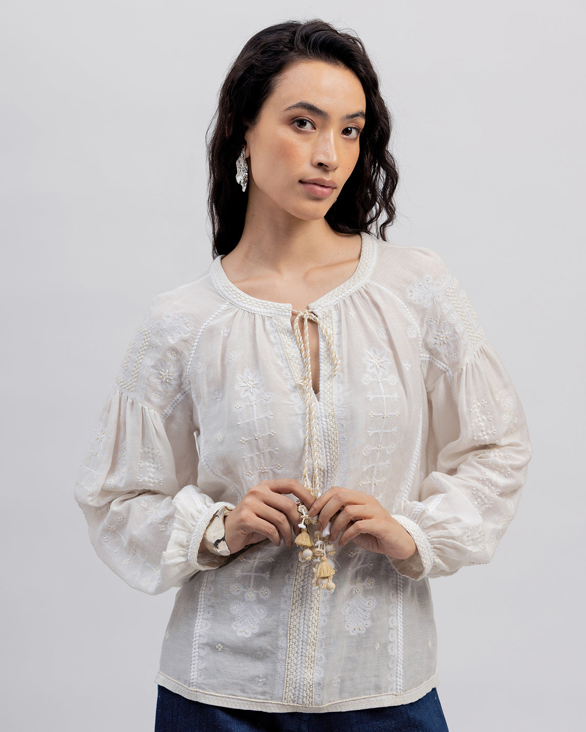 Our embroidered peasant blouse offers a contemporary take on the New Romantic style, with elegant tone-on-tone embroidery, dainty hand beading, and statement tassels. Designed for a relaxed fit, this breezy artisanal top makes for the perfect addition to your summer staples.