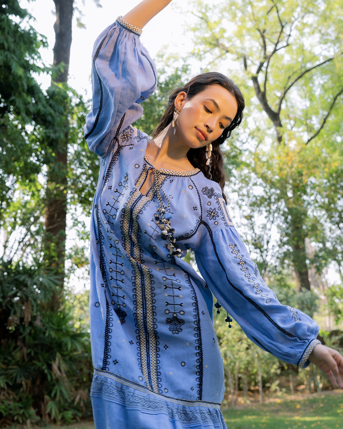Boasting exquisite hand-guided machine embroidery, this midi folk dress embodies effortless allure. Crafted in airy linen, its relaxed silhouette is complemented by hand beaded accents, artisanal tassels, and contrasting embroidery.