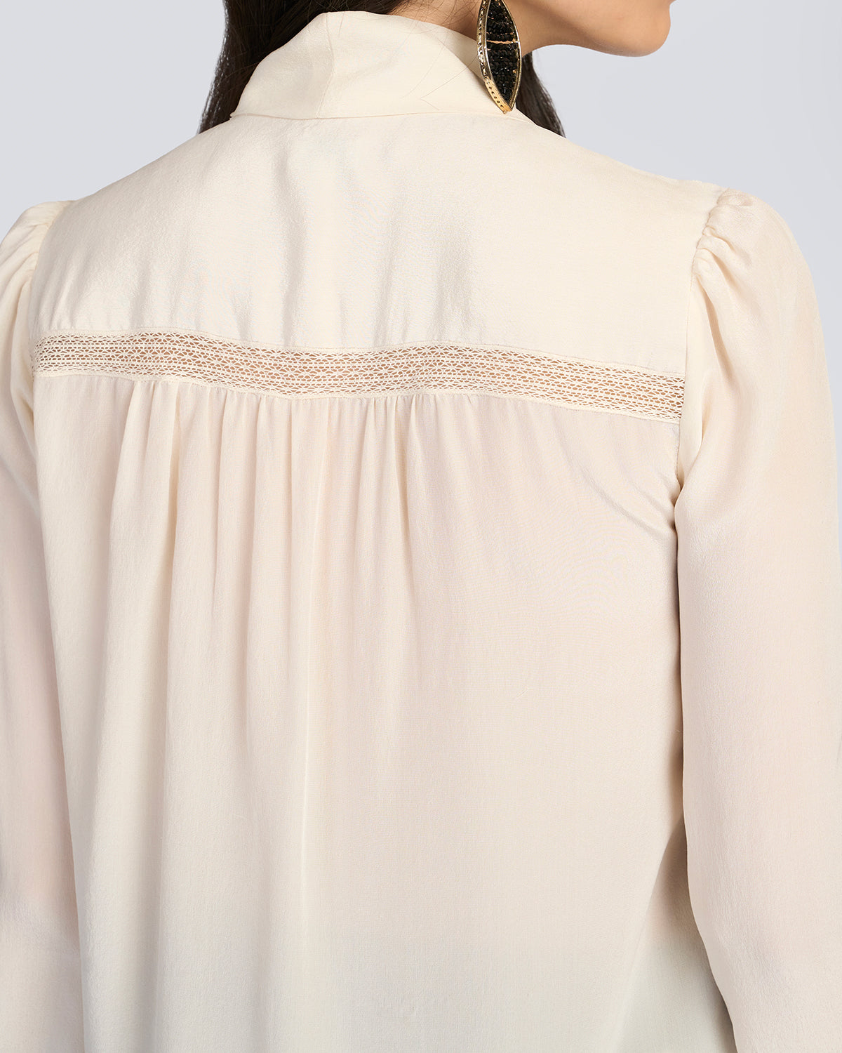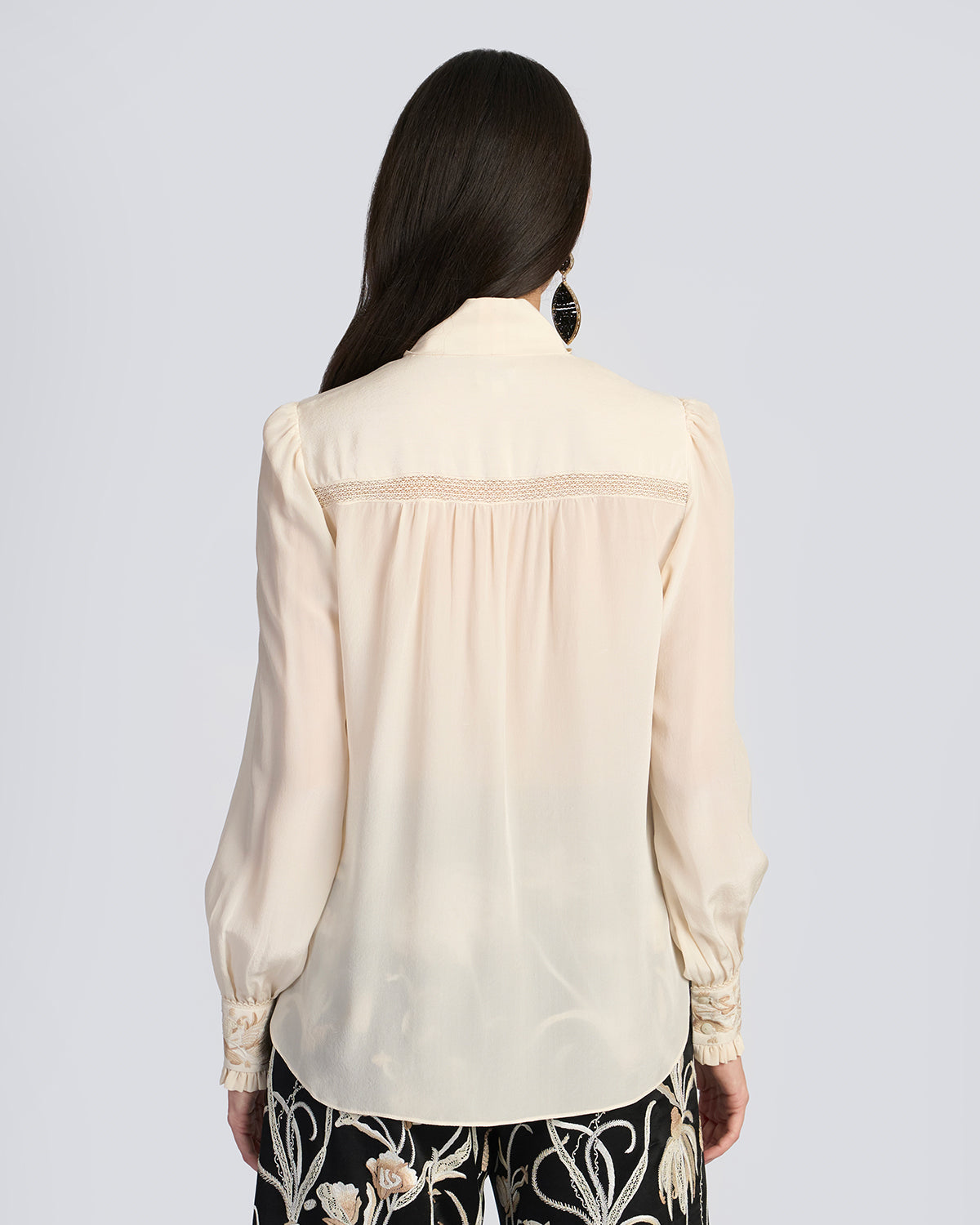 With a distinctive scarf neck tie, this pure silk blouse infuses timeless artistry with a modern design sensibility. The garment is further embellished with skilful lace work, expressive gathered sleeves, and delicate embroidery on the cuffs.