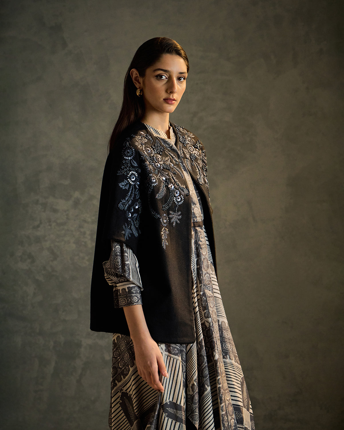 Made with pure wool fabric, the open and relaxed silhouette of our Flora Embroidered Shrug in navy blue can be layered with ease. It features intricate hand embroidery, complemented by fine beading. The subtle sequin details catch the eye from the very first glance.