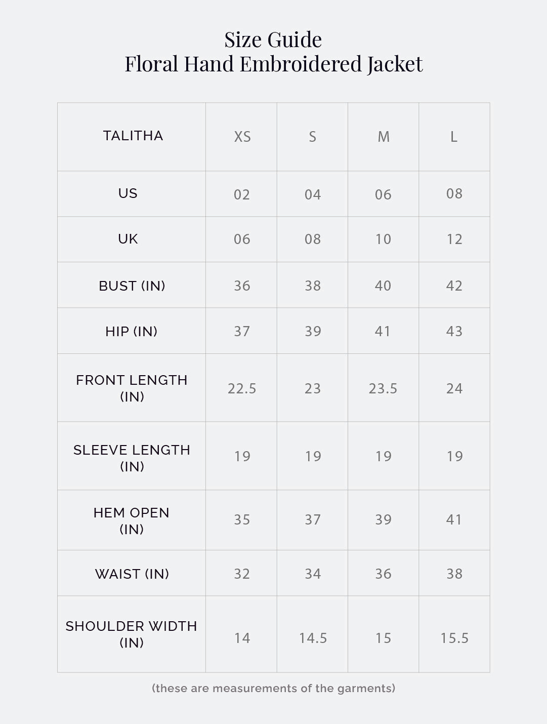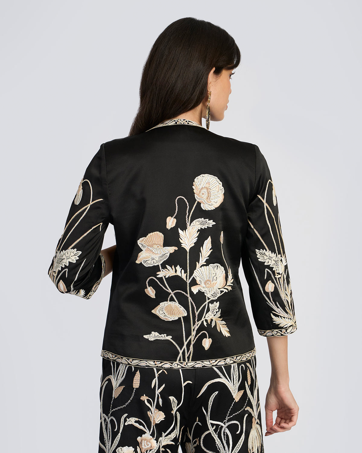 Handcrafted from pure silk, this unique jacket is a masterful blend of needlework, lace applique, and couching and Gara embroideries. Details include bold wintery botanical motifs, three-quarter sleeves, intricate hand beading, and a luxurious viscose crepe lining throughout.