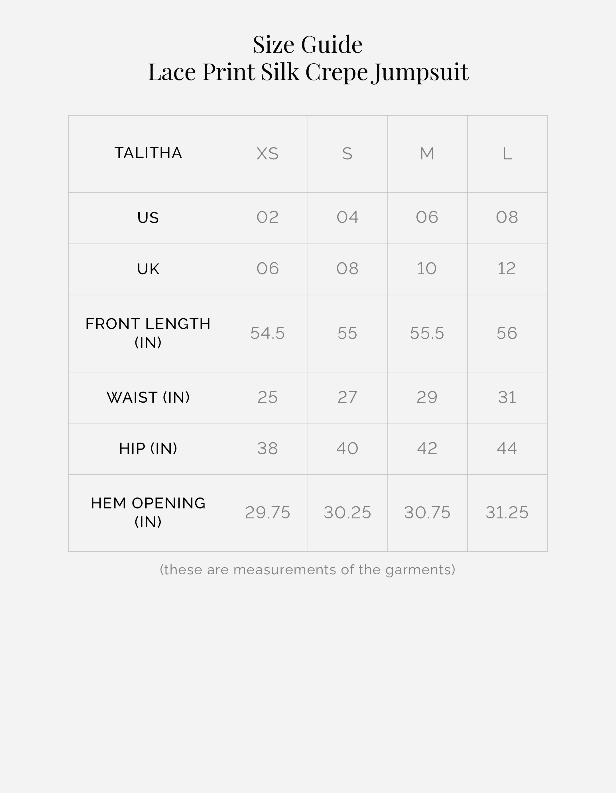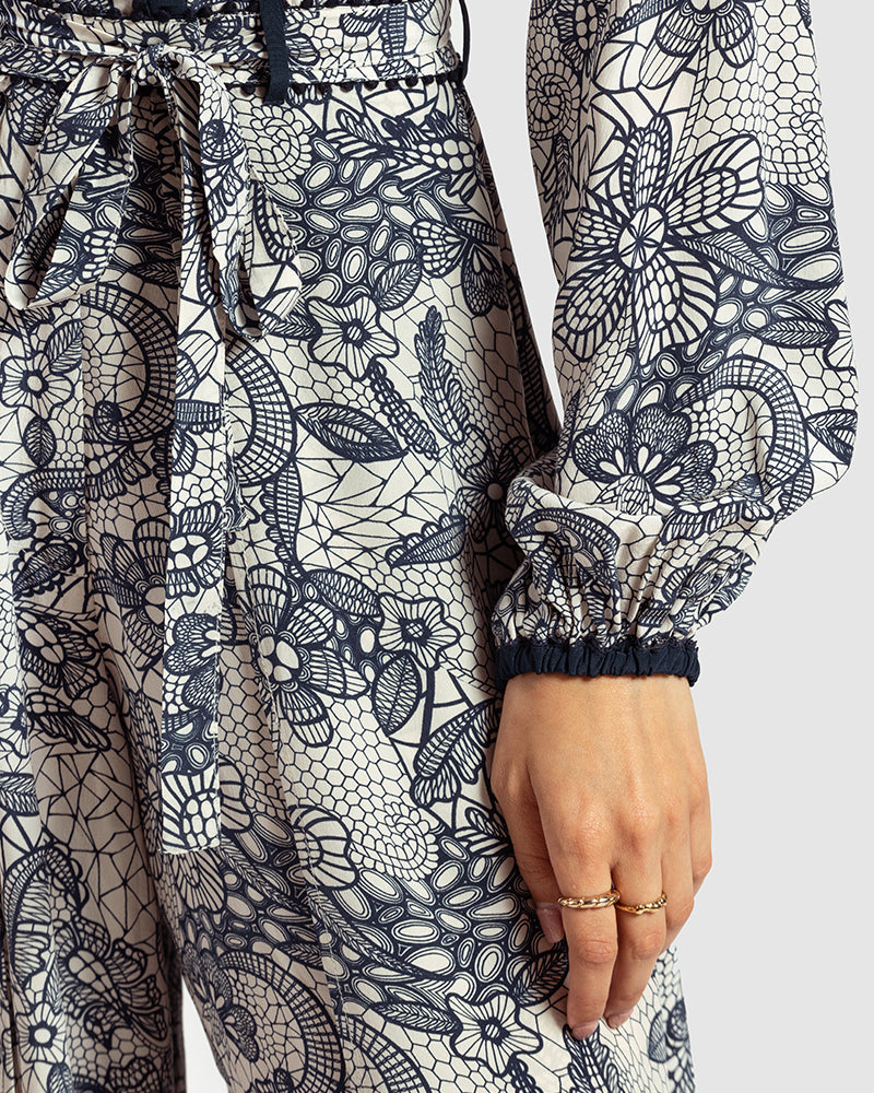 With contemporary print inspired by vintage French lace, this jumpsuit is perfect for elevating your holiday look. Details include a V-shaped neckline with a contrast neckband, bell sleeves with elasticated cuffs, a belted waistband, front neck overlap with a snap closure, and a pant zipper closure.