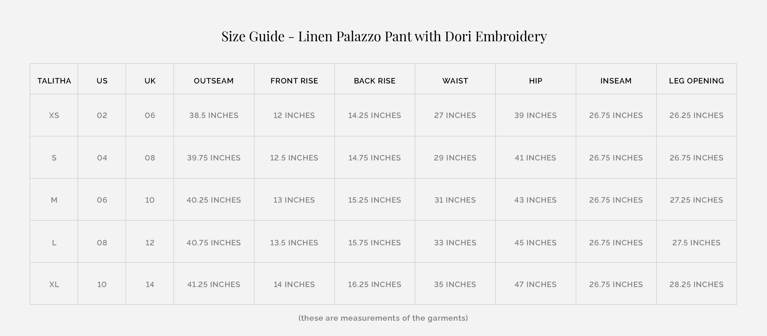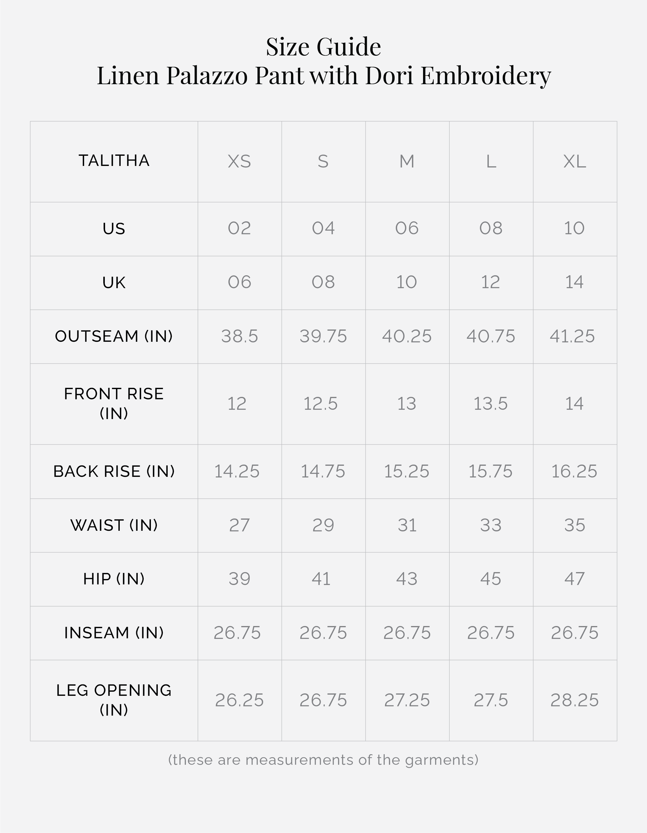 Our flared linen palazzo includes Dori embroidery all over and a delicate touch of lace at the hem. It also features a hook-and-eye zipper closure and front slash pockets.
