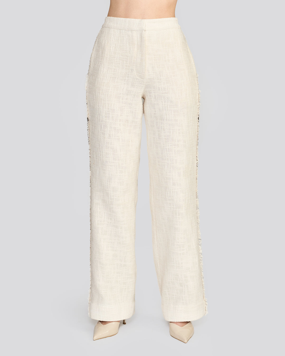 These ivory pants are crafted from textured cotton and tailored for a relaxed fit. Thoughtfully designed, they feature sleek slash pockets and are embellished with contrast hand couching embroidery along the side seams, making for a chic yet easygoing silhouette.