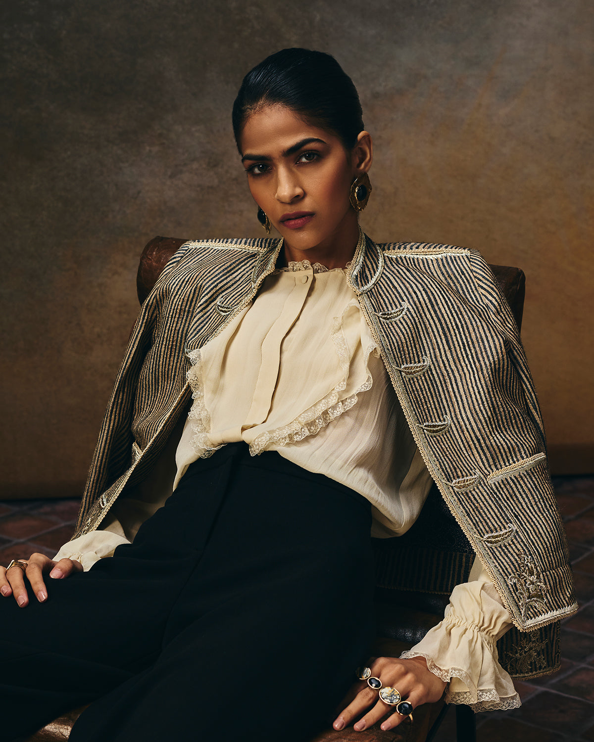 Our Maiese Ruffled Top in ivory features a silk georgette base, accented with soft ruffles and lace touches. The print reinterprets cypress forms alongside gentle florals, creating a layered visual story across this easy button-down fit.