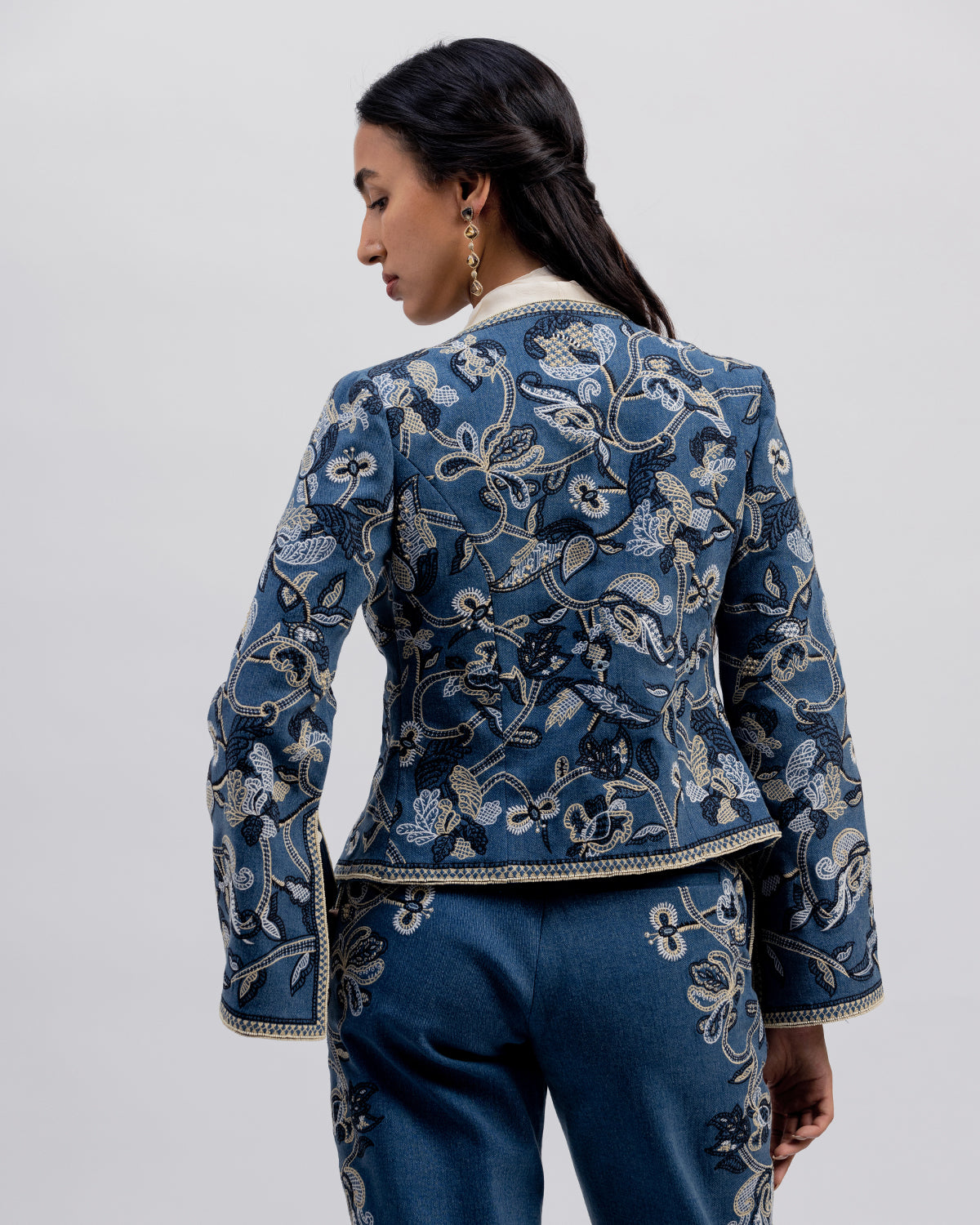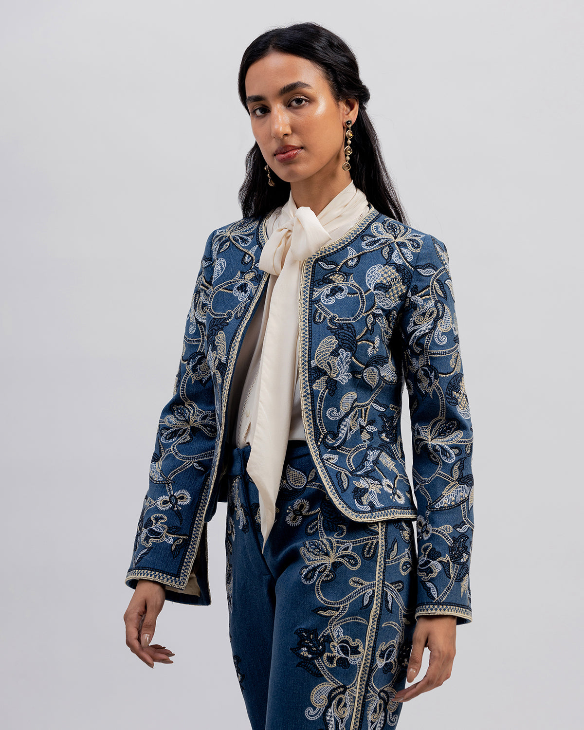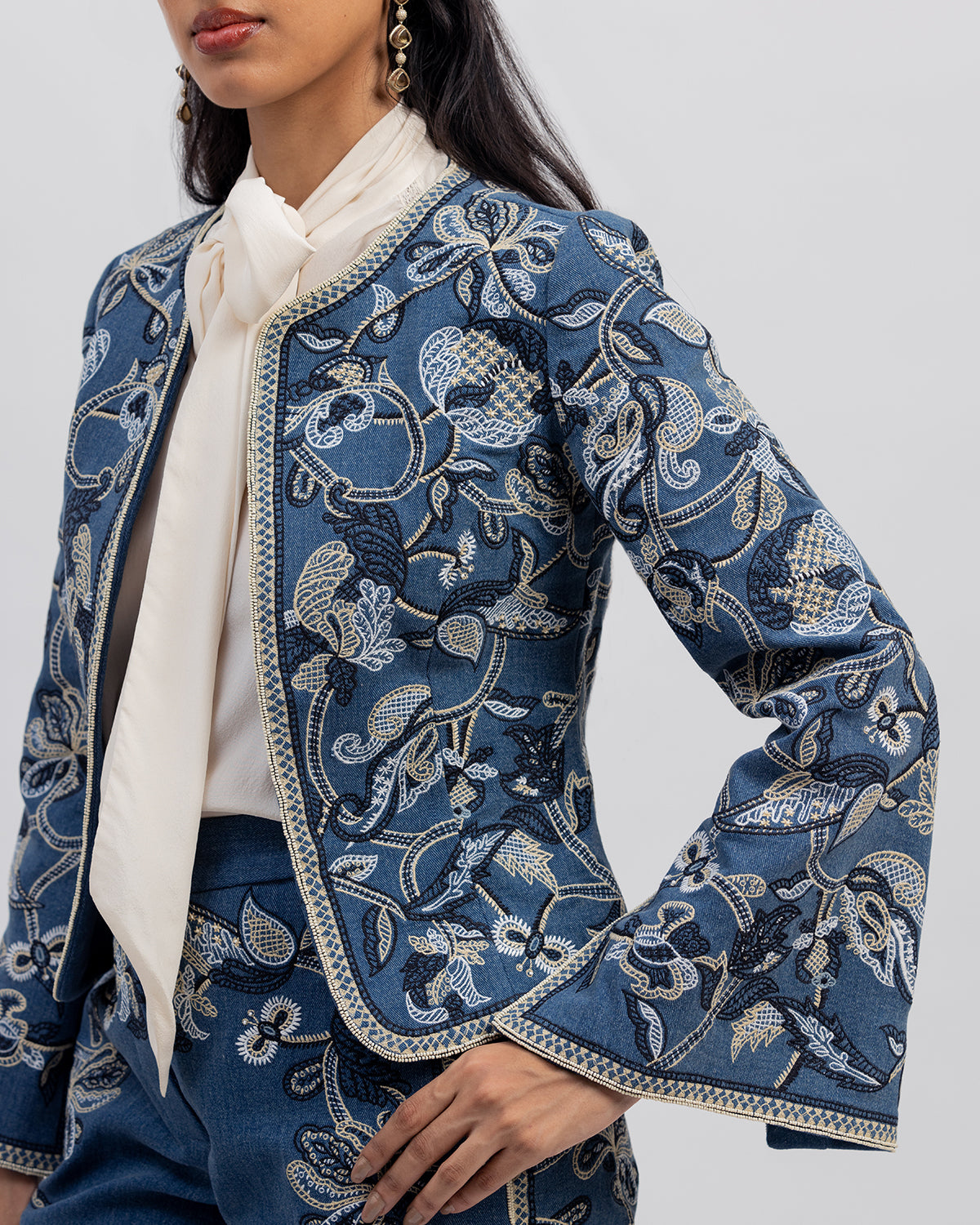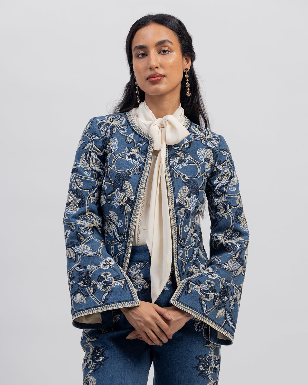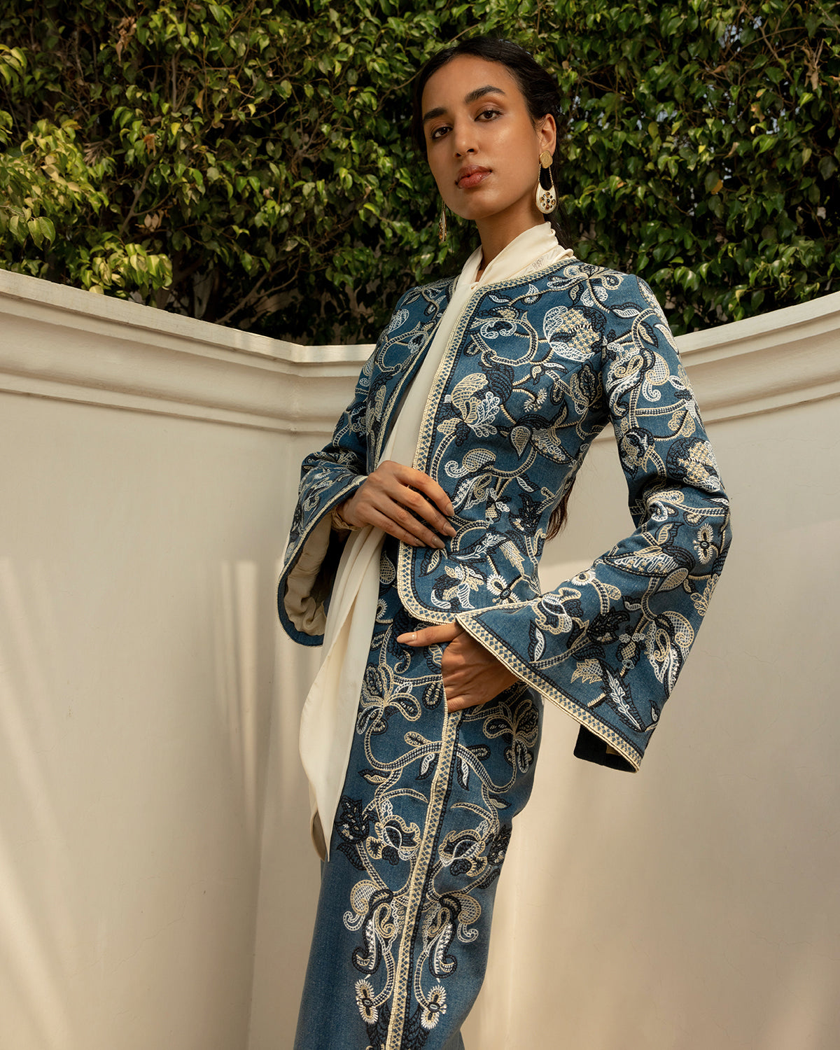 Elevate your denim staples with this intricately crafted artisanal denim jacket. Hand-guided machine embroidery and meticulous beading embellish the garment with the artistry of folk, while the sleeves add an elegant touch of flair.
