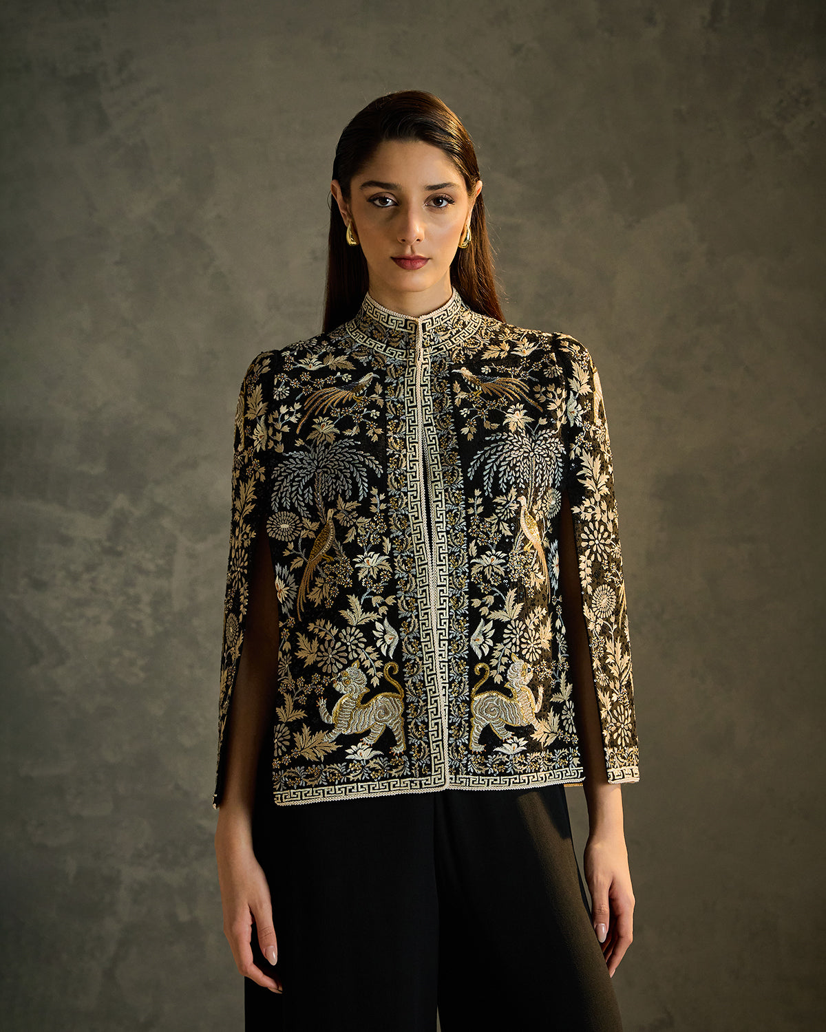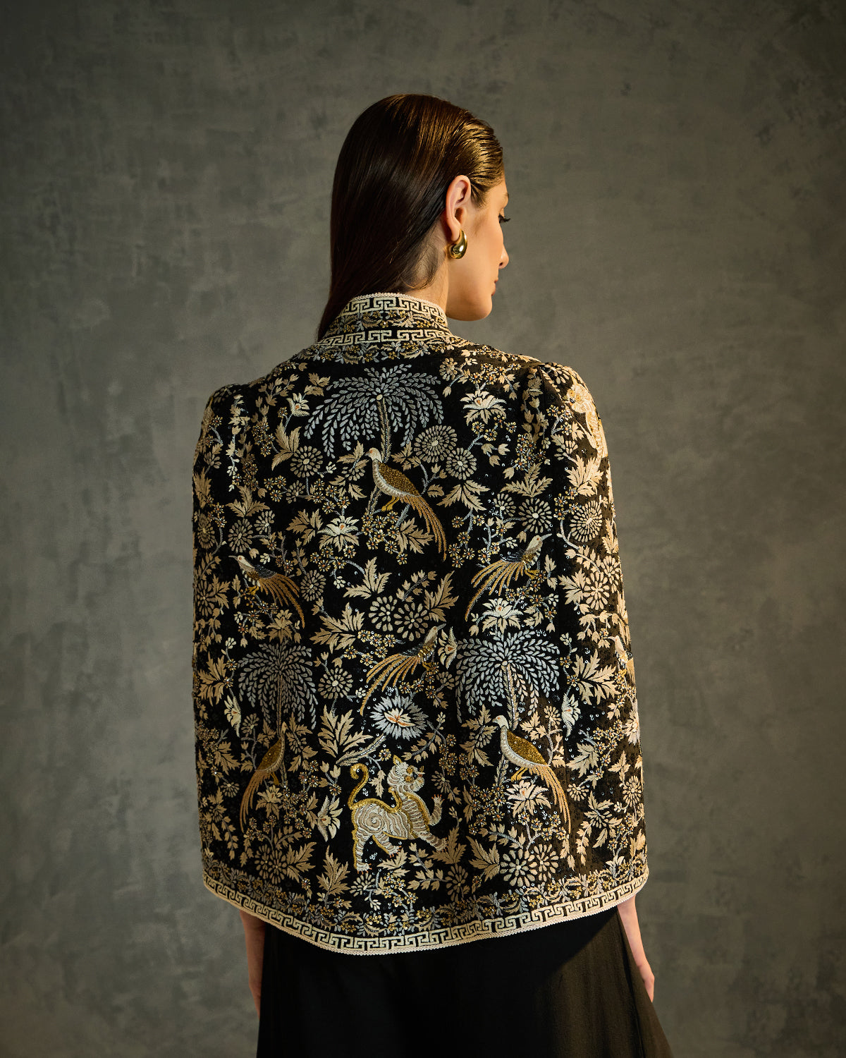 Black silk crêpe fabric sets the tone for the Petra Hand-Embroidered Cape, where Parsi Gara artistry shines through fine hand needle embroidery. Floral and mythic motifs move across the surface with quiet precision, elevated by subtle hand-placed sequins that reflect light with restraint. Finished with intricately worked borders and slit sleeves, it stands as a statement piece rooted in heritage yet designed for modern soirées.