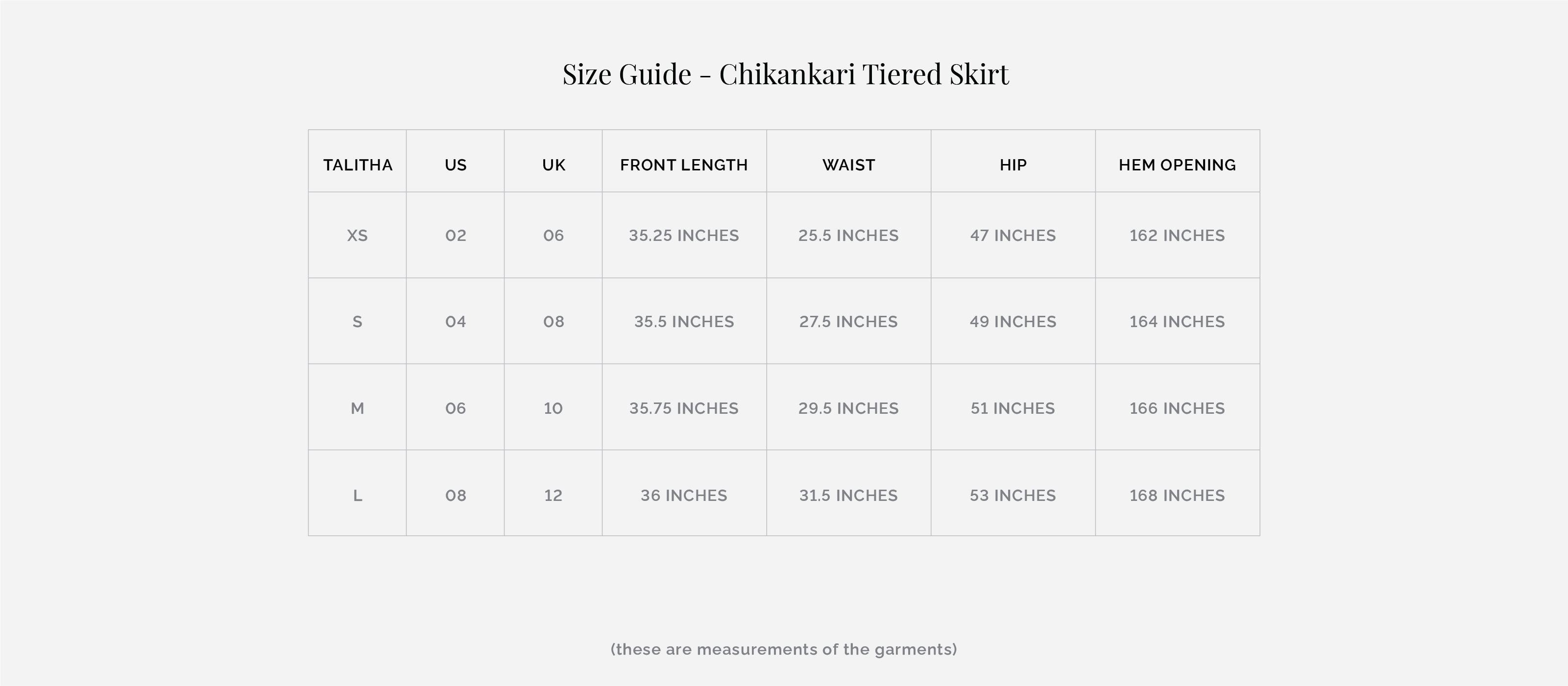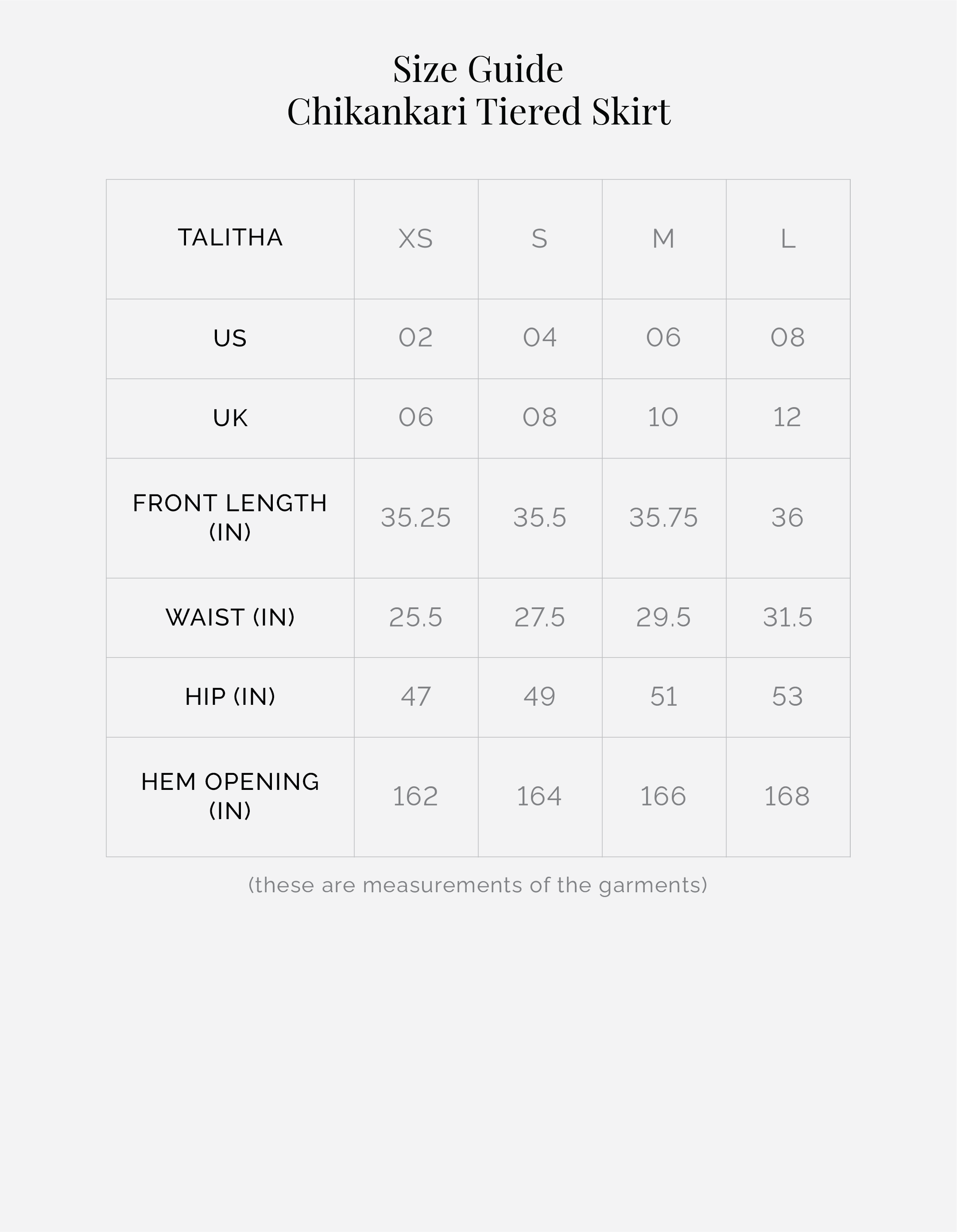Our tiered skirt features intricate hand chikankari embroidery with delicate jaali work and embossed white-thread stitching. The garment also includes lining, lace inserts, trimming along the hem, and a side seam zipper closure. Created in collaboration with Sangraha Atelier.