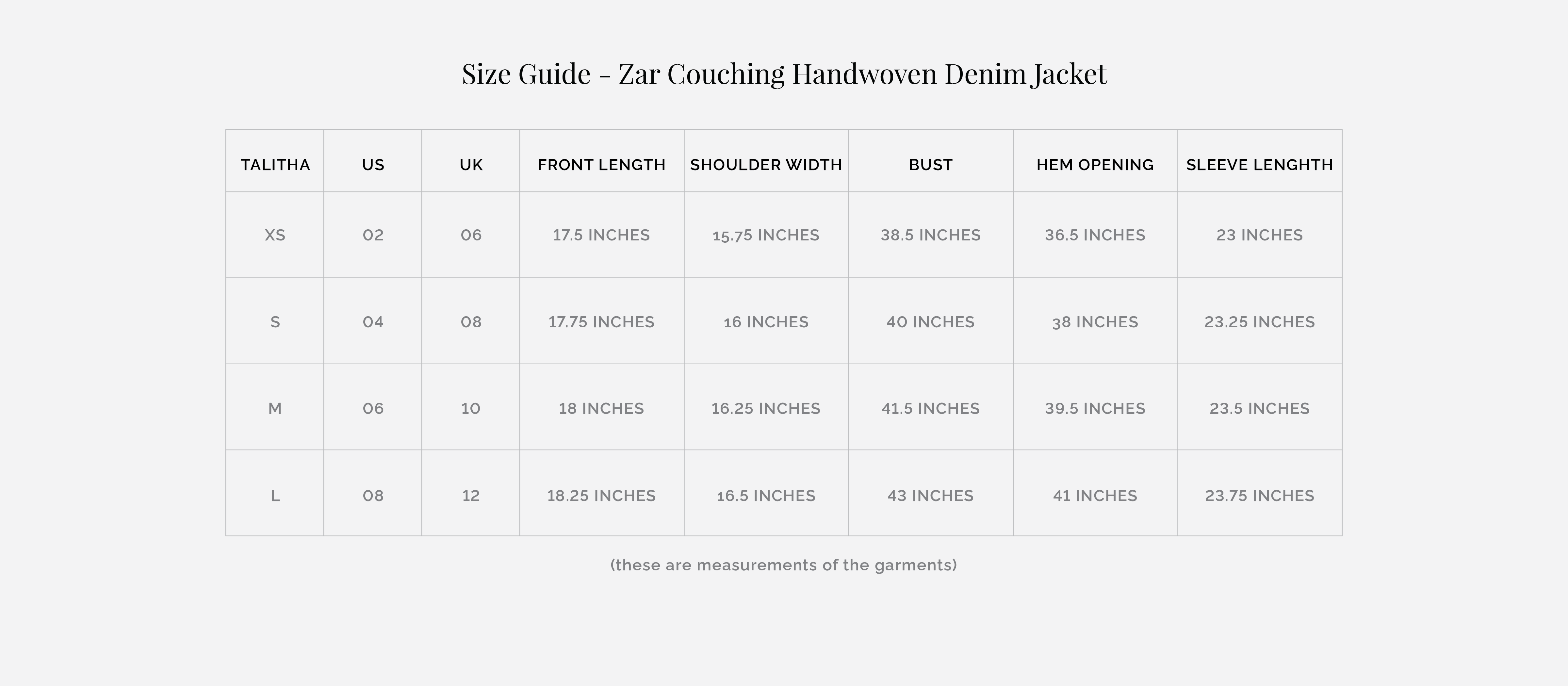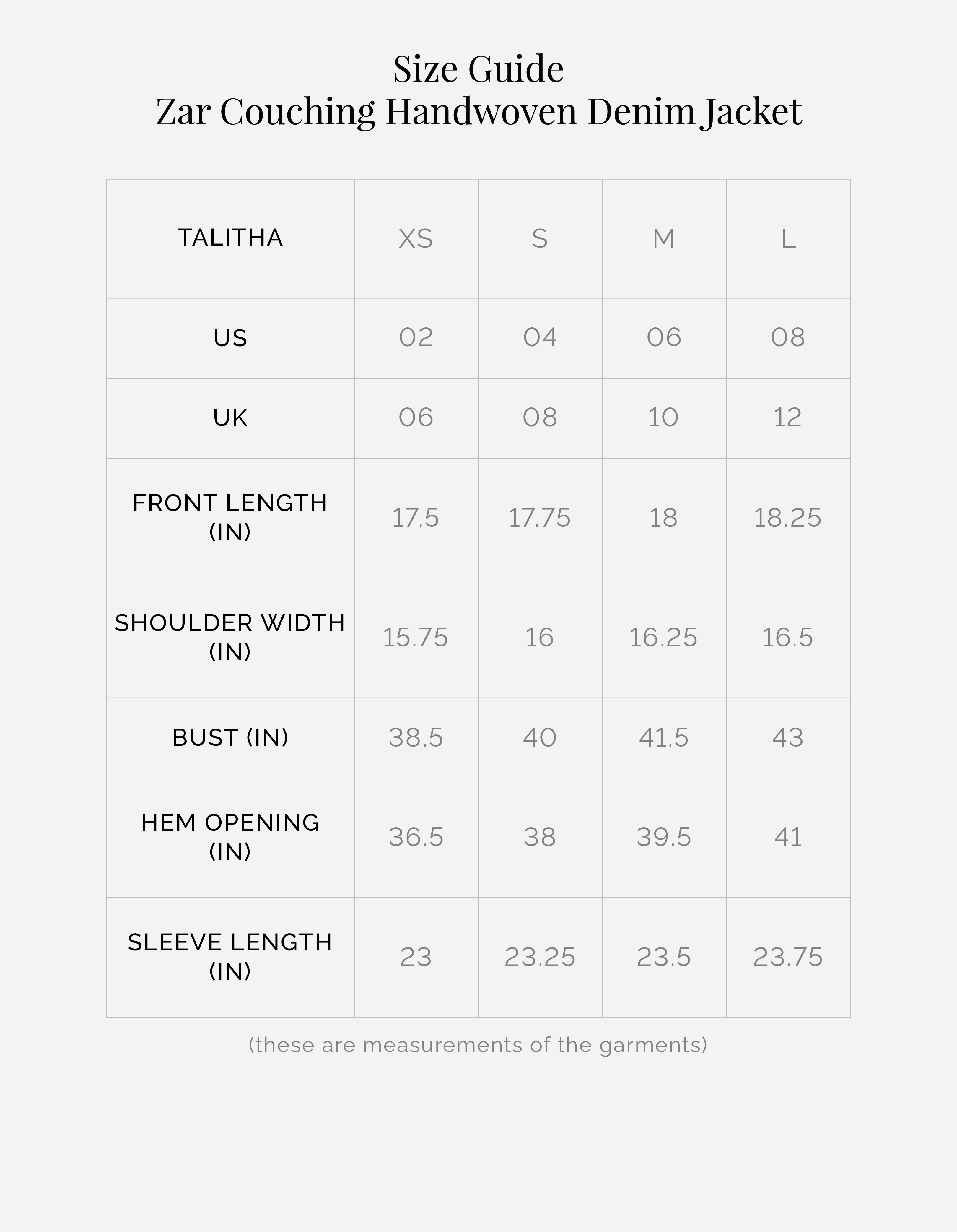 This cropped, close-fitting jacket is embellished with a mix of zardozi and couching embroideries, crafted meticulously with gold and silver threads over handwoven denim. Details include flared sleeves, overall lining, and an elegant blend of beads and sequins.